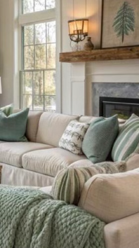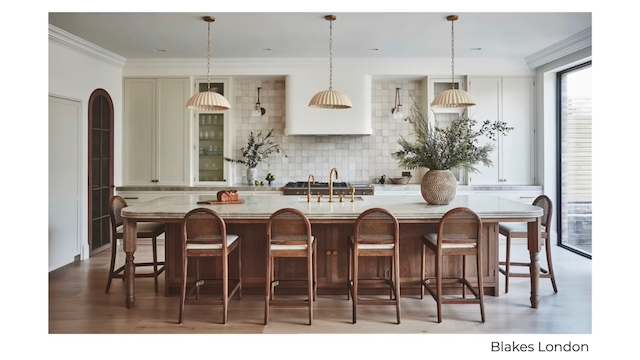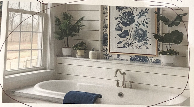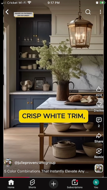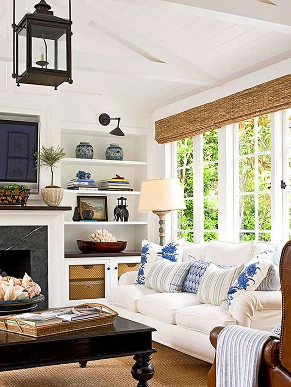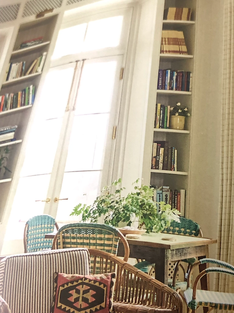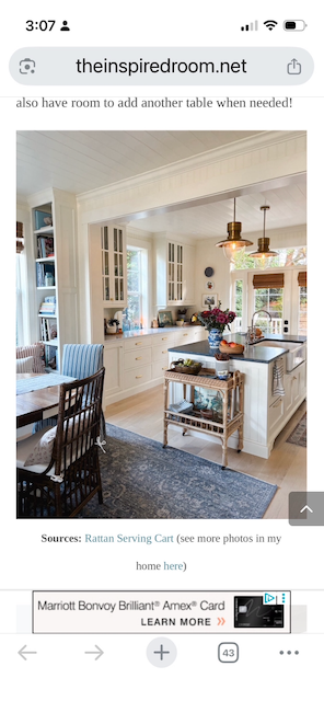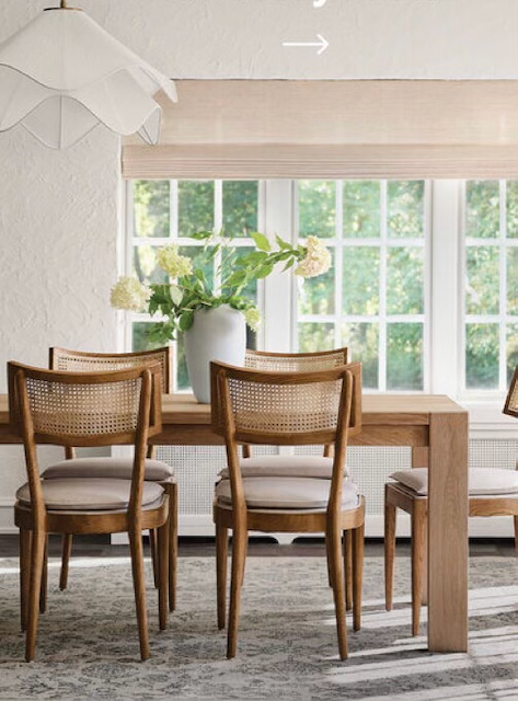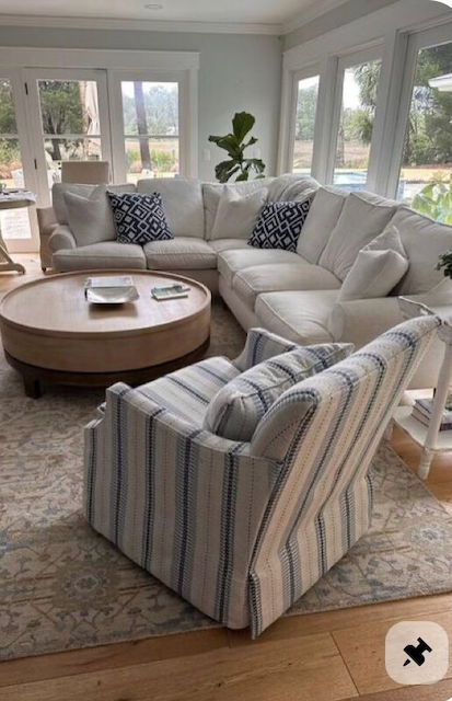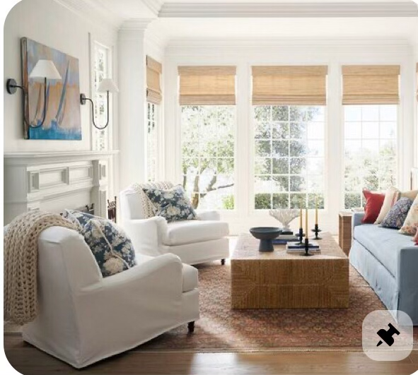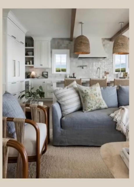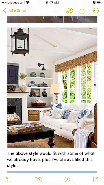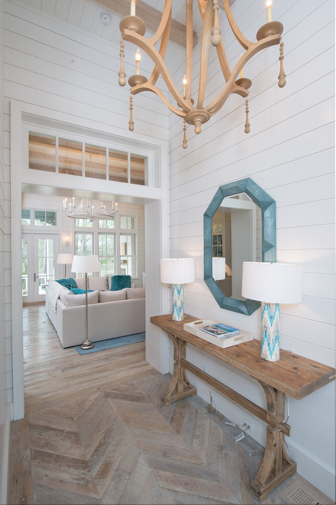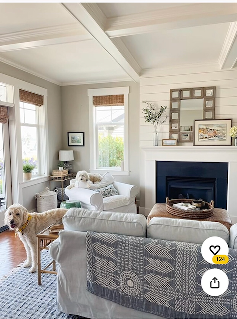 Lisa loves most everything about this picture, diagonal shiplap ceiling, beams, moldings, flooring and color...french door, warm white wall and ceiling color, fireplace style, cute chairs